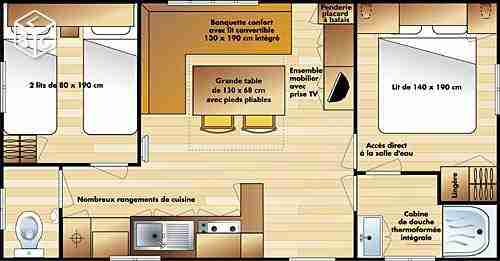 Pour votre bien-être, le mobil home est entièrement équipé et meublé, il se compose :